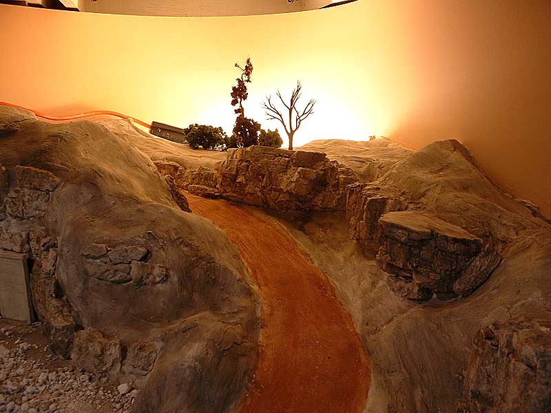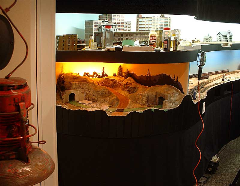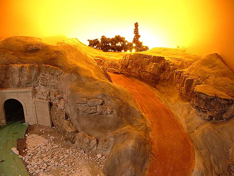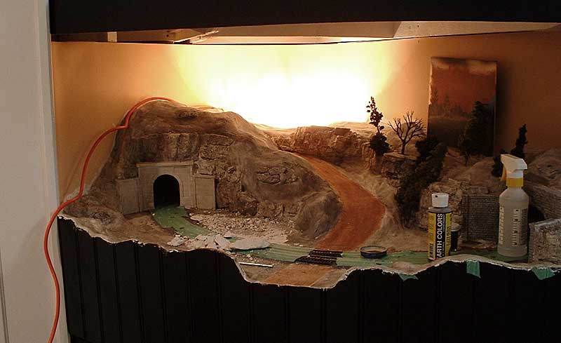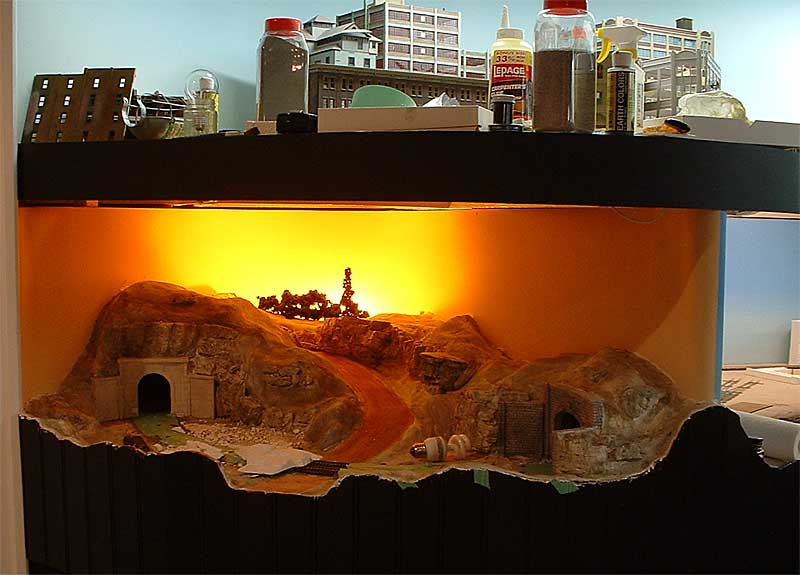 I put a trouble light behind the hill, and stuck a few trees around to see how it could work. A sample of the backdrop was painted onto a small piece of wood to simulate the backdrop. The imagination is used to fill in the rest. Ignore the orange wire on the light….