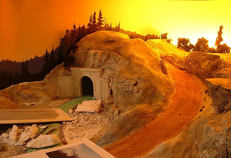 I applied a wash of color to the entire surface, including the rocks. The tunnel portals are also stained.