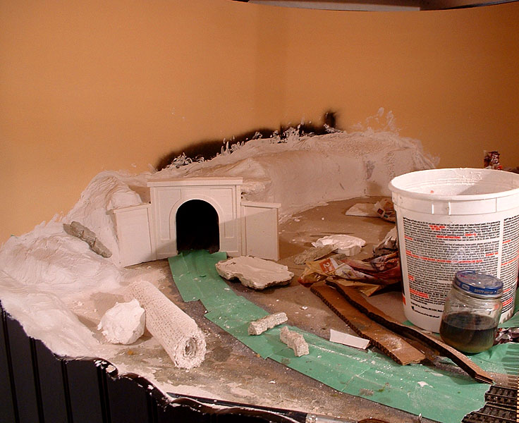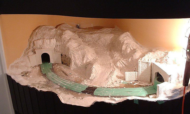 I started by constructing the tunnel lining. I wanted the inside of the tunnel to look like it was blasted from solid rock, so I made several rock castings to use for the lining. I lined them along the track behind the Woodland Scenics tunnel portal, and covered the entire thing with plaster cloth to close it all in. That plaster cloth is great stuff! All you need to do it dip it in water and lay it in place, no racing the hardening of plaster while you dip paper towels into it.